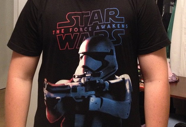 ▲T恤上印著《星際大戰:原力覺醒》的圖案:以及一名帝國風暴兵舉起好大一支槍!圖/翻攝自網路)