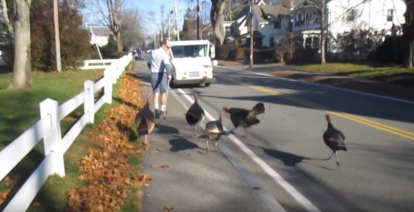 郵差除了會被狗追之外,在美國麻州可能還要小心野火雞。麻州法爾矛茲鎮(Falmouth)一名郵差在送信過程中被5隻野火雞追趕,讓他不得不頻頻回頭用手裡的桿子驅趕,但這5隻野火雞似乎完全沒有要罷手的意思。網友雖然覺得郵差很辛苦,但看完影片還是忍不住大笑。