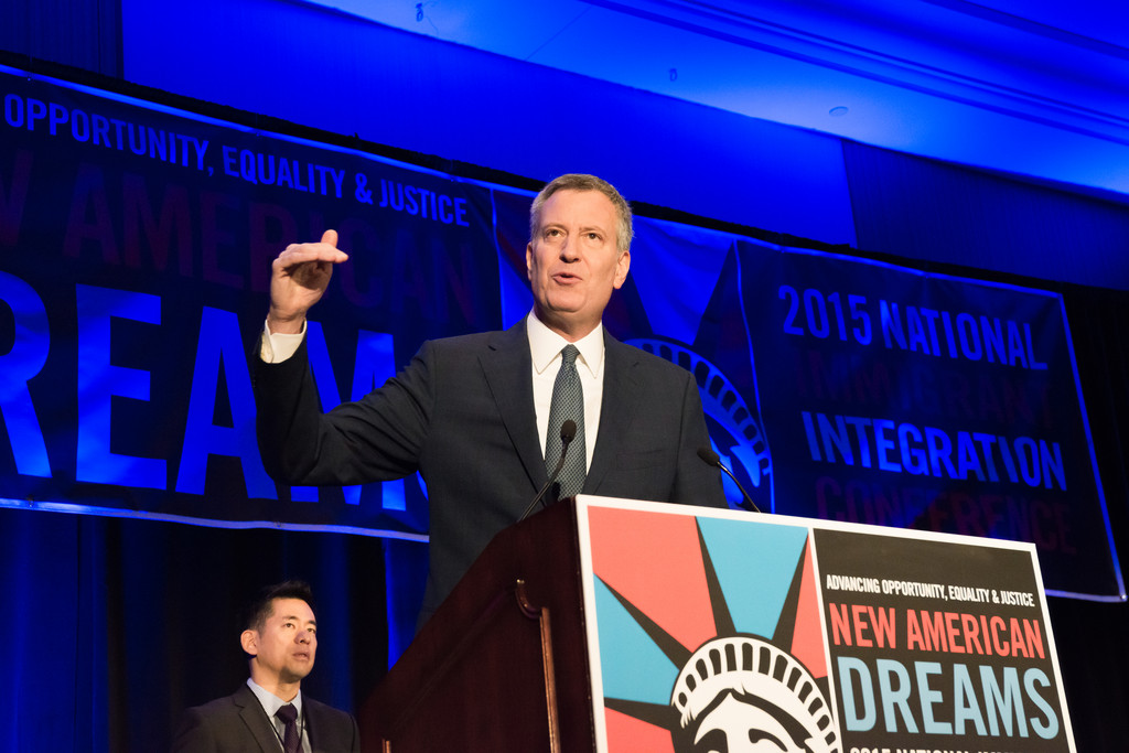 美國「全國移民整合大會」14日在紐約市布魯克林舉行,紐約市長白思豪在會上宣布一個「行動紐約」(ActionNYC)計畫,預定在2016年斥資790萬美元(約台幣2.6億元),為移民提供法律諮詢、免於受人蛇集團詐騙或拐賣,並幫助他們合法取得美國公民身分。