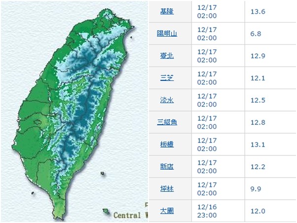 氣象局表示,晚上到17日清晨將是這波冷空氣威力最強的時候,嘉義以北和宜蘭沿海、空曠地區及馬祖、金門下探10度,花東縱谷也不排除可能出現10度的低溫,至於南部及花東也只有13、14度左右。此外,強烈東北風影響,台南以北、東半部、恆春半島及蘭嶼、綠島、澎湖、金門、馬祖空曠地區及鄰近海域易有9至11級強陣風,沿海地區易有較大風浪出現。