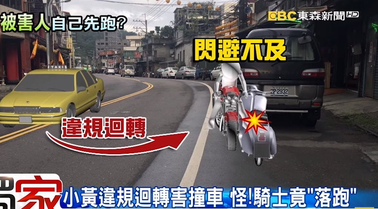 ▲ 小黃違規迴轉害撞車,怪!騎士竟「落跑」。
