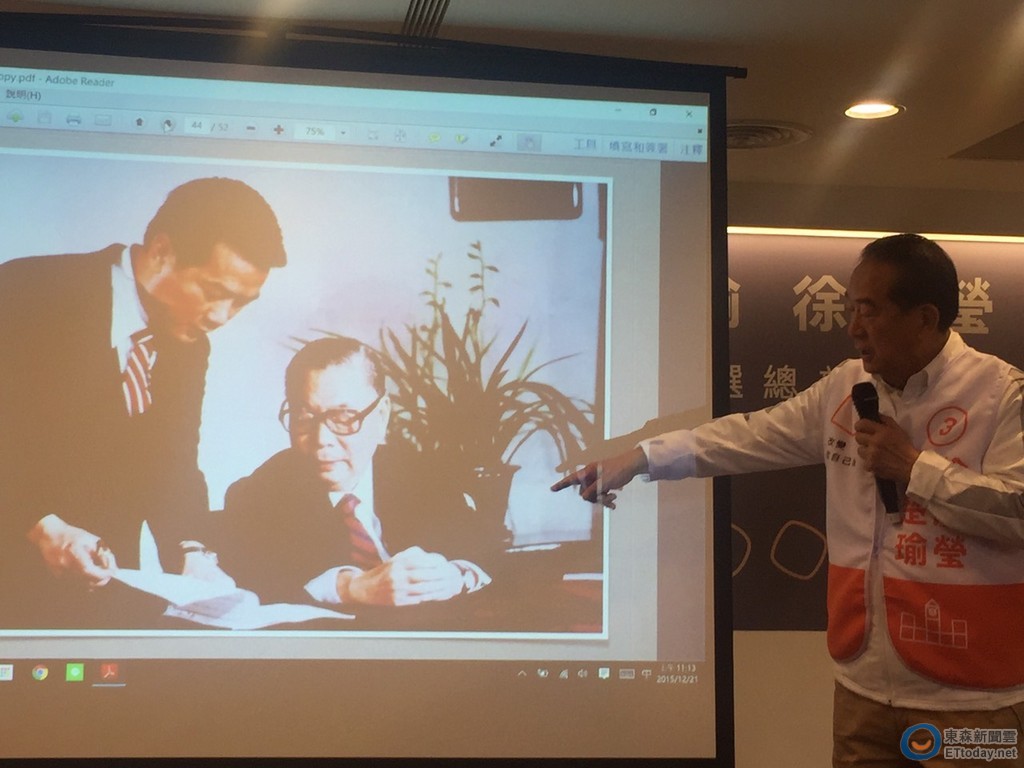 ▲宋楚瑜在記者會中秀出多張當年與蔣經國共事的老照片。(圖/記者張暐珩攝)