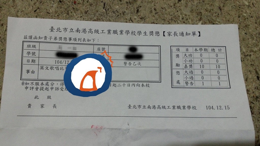 一名徐姓家長21日晚間在「爆料公社」貼文,指他收到南港高工的獎懲通知單,「當場傻眼」!通知單上記載,就讀高一某班的學生在12月11日,因「英文歌唱比賽表現認真」,得到「警告乙次」。該名學生本學期共累計10支嘉獎,另有警告一次,整體表現相當優異。