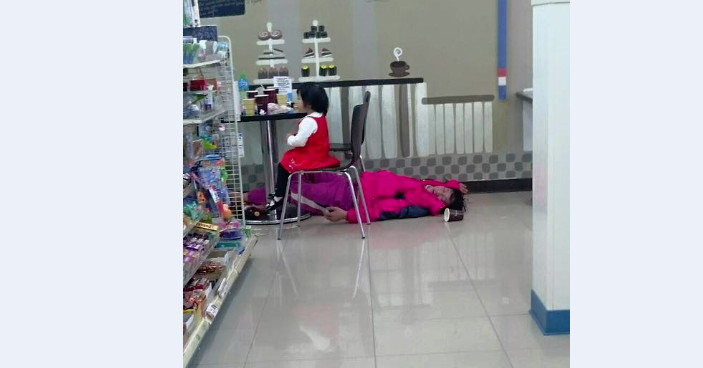 帶著小孩喝成這樣,還直接躺在超商地板!有民眾在「爆料公社」中PO了一張照片,一名穿著紅色衣服的小女孩就坐在超商的椅子上默默等著,趟在身旁地上的男子,網友看到驚呼「好扯,太誇張了吧!」