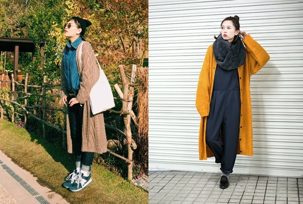 冬天怎能忘了風衣呢?長版的單品穿起來最危險,稍微沒搭好,腿就會看起來很短。因此下身的搭配非常重要!像左圖的同色系鞋襪就容易有視覺延伸的感覺,雖然圖中示範是穿一般運動鞋,不過我們可以偷偷換成增高運動鞋,(或是在運動鞋裡塞鞋墊)(笑)。而右圖不只有包頭加分,捲起的褲管跟高跟鞋也是讓你看起來比較高的關鍵。