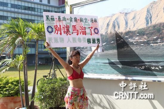 今日上午高雄市選委會進行9個選區共40位候選人的號次抽籤,輪到柳淑芳時,她直接在台下脫掉洋裝,大方露出鮮紅色內衣,配上她的碎花小短裙,慢慢地走上台抽籤,抽完後還不忘拉開自備布條,上頭寫下「別讓馬溜了」表達訴求。