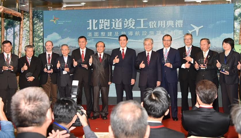 總統馬英九、行政院長毛治國與交通部長陳建宇24日桃園國際機場北跑道整修竣工啟用典禮,並共同見證第一架使用新跑道的華航CI160班機啟航。桃園國際機場公司表示北跑道歷時294天施工,耗資新台幣21.36億,終於在今天提前整修完工,讓機場跑道每小時容量將由30架次提升至50架次,航班整點率可望達成98%的目標。