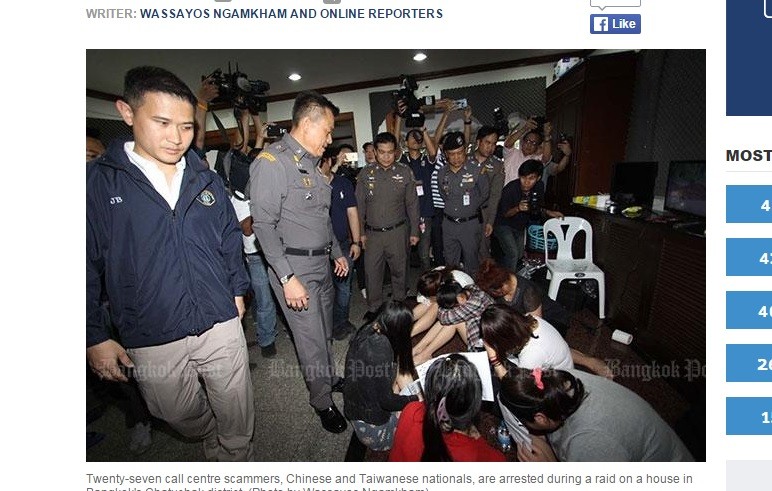 根據《曼谷郵報》報導,警方與調查局人員昨天在洽圖洽一處公寓逮捕了27人,其中14名大陸籍、13人持有中華民國護照,現場發現了30部的電話機、多本電話簿與電腦等網路設備,都一併帶回,房間也特別用隔音牆,並架設許多監視器,這些詐騙集團主要透過電話詐騙大陸民眾,將存款匯到指匯帳戶,得手1億泰銖。