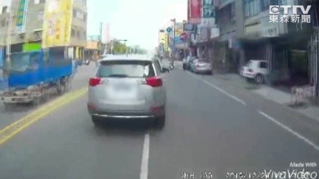 一旁的銀色休旅車急切到公車前方行駛,突然放慢速度,接著只要這輛公車往外切,休旅車就跟著變換車道,步步進逼。