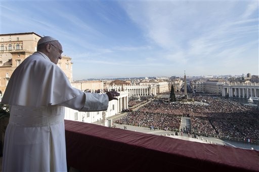 教宗方濟各在當地時間25日時,在聖彼得大教堂發表聖誕祝福談話。在今年的談話中,他提到有關歐洲難民、中東衝突的困境,希望世界能達成「和平與和解」。