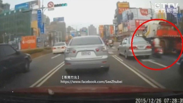 新竹縣竹北市自強南路和文興路口近日發生一起死亡車禍,當時以為是拖板車駕駛右轉,因視線死角導致女騎士被輾進車輪下;還好後方一輛轎車的行車記錄器正好拍下過程,讓車禍的原因大逆轉。