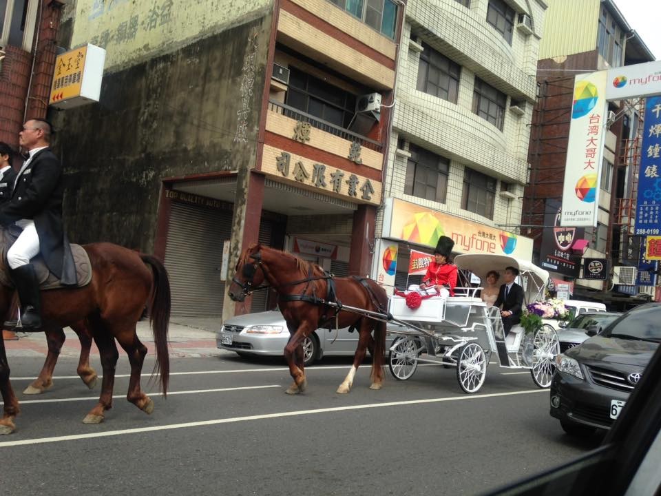 網友昨日在「爆料公社」貼文,照片中可見一對新人坐在白色馬車裡,還有英國衛兵打扮的馬車夫為他們駕車,前方則有西裝筆挺的親友開路。據悉,昨日是兩人的訂婚宴,女方家族因為經營馬場,所以打造超浪漫馬車作為禮車,送新人到喜宴的飯店。