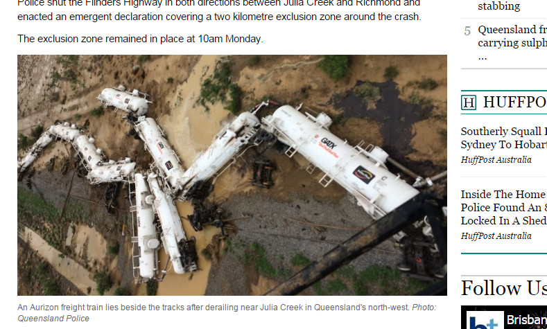 據了解,這輛貨運列車是在茱莉亞溪鎮(Julia Creek)東部約20公里處翻覆,根據事發現場的照片可以看見,白色的列車翻覆後,車頭及26節車廂散佈在鐵道附近,鐵道也扭曲變形。