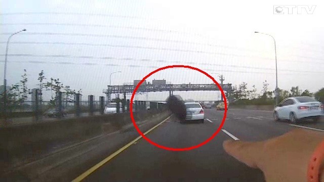 日前李先生載友人從台中南下,經過國道一號台中與彰化交界時,發現前方車輛紛紛踩煞車,以為發生事故,但仔細一看,國道上竟出現「翻滾的輪胎」在車道上跳躍!後來報警才知道,是前方一輛拖吊車上的車子掉落輪胎,造成國道上演「翻滾吧!輪胎」。