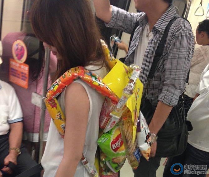 「加藤均台灣粉絲團2.0」28日PO出一張照片,並寫道「擁有好吃背包的女孩」,頂著鮮豔的橘黃紅配色超吸睛,多款零食應該讓路人快要「凍未條」了吧!網友對此紛紛表示,「太前衛了!隨時隨地都可以吃」、「有心想讓人家非禮」、「可惜在捷運上,看的到吃不到」、「我女兒應該很愛」。