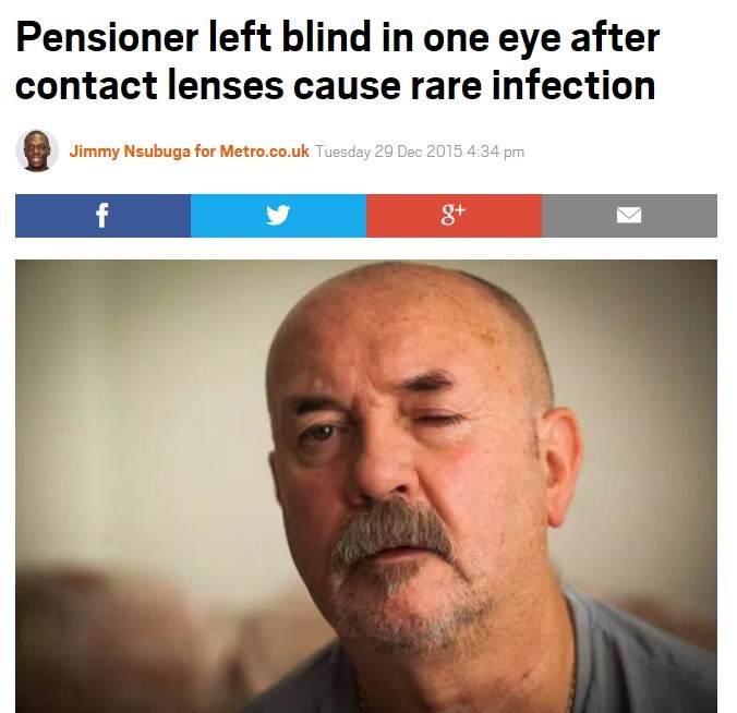 英國德翁郡63歲的男子蘇特(Stephen Souter)戴同一副拋棄式隱形眼鏡長達3年,今年1月時左眼忽然感到腫痛而去就醫,當時醫生以為只是普通感染,要他回家點眼藥水就好,不料病情卻愈來愈嚴重,再次檢查後才發現眼角膜因寄生蟲破壞,罹患了「棘阿米巴角膜炎(Acanthamoeba Keratitis)」,最後導致失明。