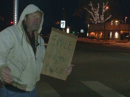 ▲美國丹佛一名男子站在路旁,手持著標語寫道,「微笑,我就給你一塊錢!」(圖/翻攝自網路)