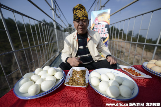 據《人民網》報導,被民間譽為「湖南大胃王」的潘一中,在高空玻璃橋上表演吃麵包蟲配水煮蛋,不但吃得津津有味,還在短短半小時內,解決36顆水煮蛋和一盤活生生的麵包蟲。