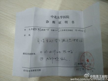 根據《中國日報》報導,這名女大生叫王越聰,來自遼寧大連,目前就讀機電工程學院飛行器製造工程專業三年級。根據她在個人微博的描述,2年前她入學開始,常因為一些小事而和3名室友起爭執。她不僅常遭3人冷嘲熱諷,甚至個人物品還會被室友隨便亂丟到寢室外,甚至還被板凳打傷。