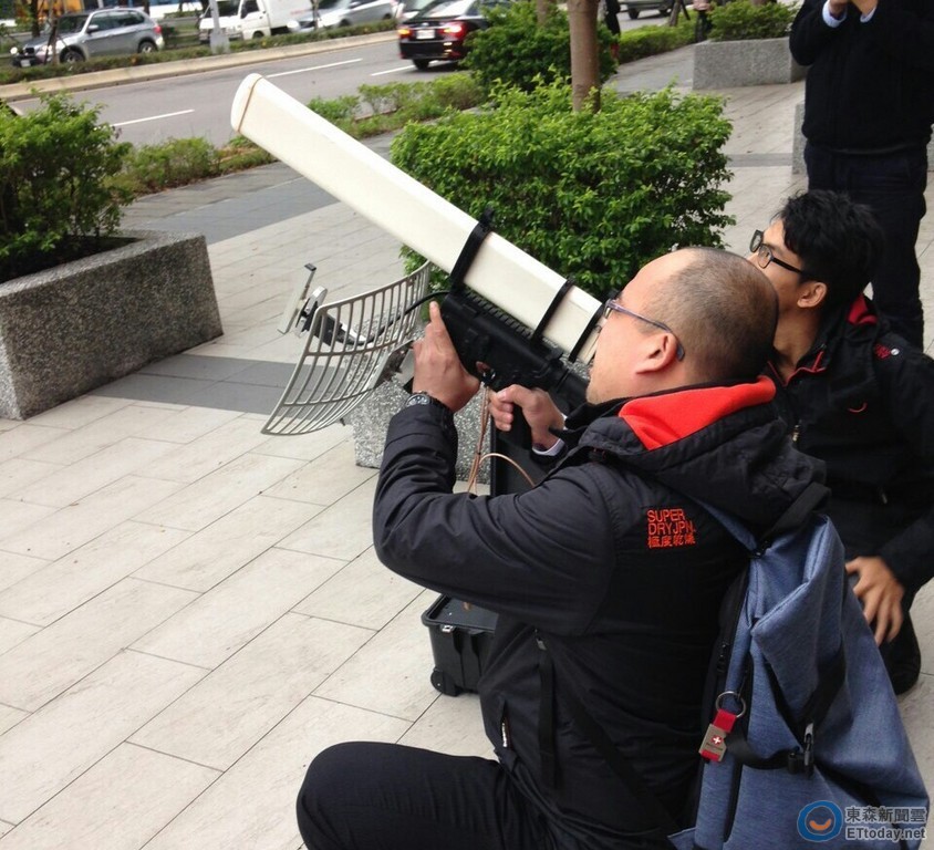 台北市信義分局在30日下午展示這套無人機攔阻槍。外觀就像一把加大加長槍管的大支步槍,上還裝了簡易雷達,號稱「無人機剋星」,其實就是一般俗稱的「電磁波來福槍」。一支要價約15萬元,中國大陸、美國等都有生產。