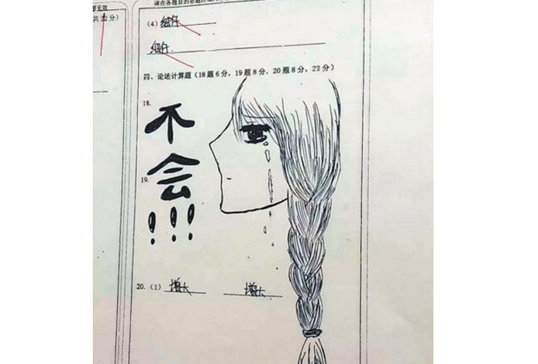重慶大石化區某高中女學生冰冰(化名)在作答物理試卷時,因為計算題不會寫,所以在一大片空白處畫上淚眼婆娑的小女孩,旁邊還寫著「不會」。班導王老師看到後向她問明原因,知道後不但沒生氣,還在下面回道,「我們要有一雙善於發現美的眼睛,美美的畫讓我們感覺這一天幸福滿滿,至少每個人都笑了。」