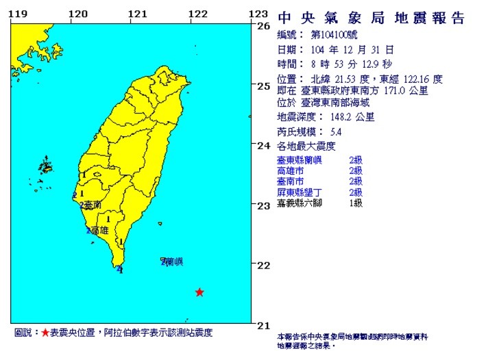 根據中央氣象局地震測報中心地震報告指出,台東縣蘭嶼、高雄市、台南市以及屏東縣墾丁的震度都為2級,嘉義縣六腳也有1級。中央氣象局表示,地震發生原因是菲律賓海板塊擠歐亞大陸板塊,因此屬於正常能量釋放。