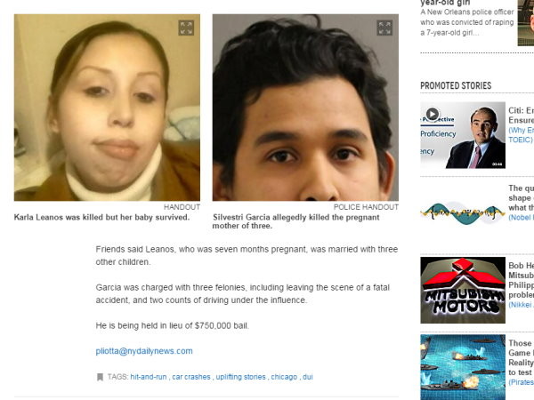 根據《紐約每日新聞》(New York Daily News)報導,26歲的女子卡拉,上月24日晚間10時左右,她在芝加哥恩岱爾(North Lawndale)過馬路時,不幸被一輛疾駛而來的轎車撞上,卡拉腹中還有一個懷胎7月的孩子;只是卡拉被送醫急救後,仍因傷重不治,但奇蹟的是孩子竟然生還下來。
