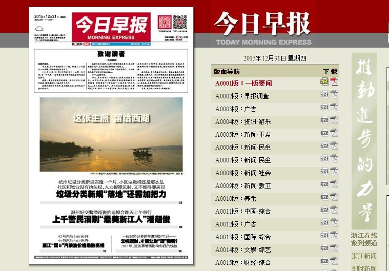 浙江《都市週報》在官方微信上表示,「轉型時期的媒體,往往扮演兩個角色,一個追問未來,一個糾結記憶,我們想得更多的事,要以一種什麼樣的新方式和你約會」,宣布將暫停出刊,轉為線上營運。而浙江日報報業旗下的《今日早報》31日也在頭版刊登「致謝讀者」宣布停刊消息。