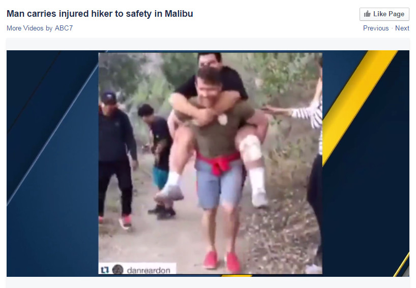 ▲美國加州一名127公斤的壯男不慎跌落山坡,竟遇到好心人揹著他走了將近四公里下山!(圖/翻攝自臉書)