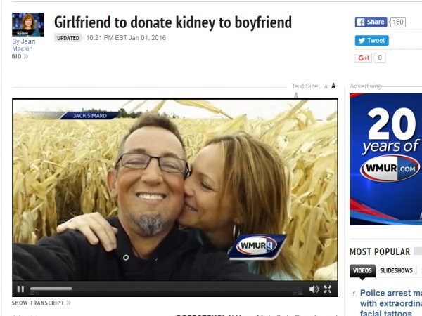 ▲美國一名男子等待捐腎,女友去檢查後和他條件相符,願意捐腎救男友。(圖/翻攝自《WMUR Manchester》)