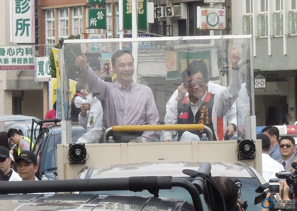 ▲朱立倫與王進士站上吉普上掃街催票。(圖/記者賴映秀攝)