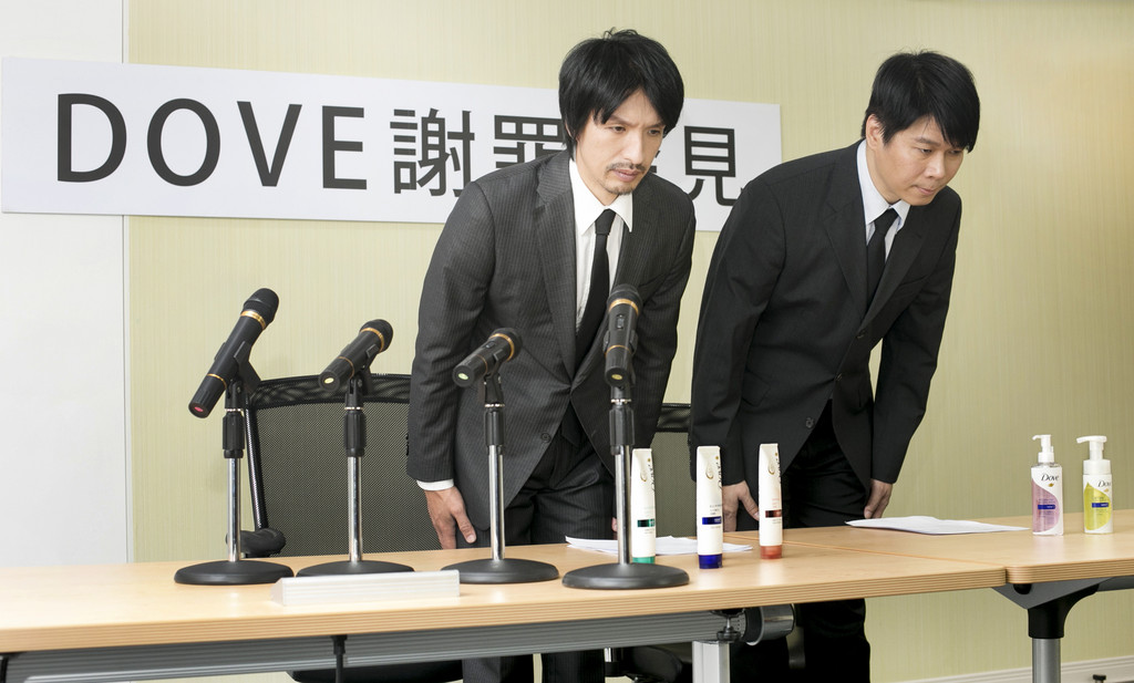 斗大標題寫著「多芬謝罪會見」(多芬道歉記者會),高階主管與研究員一字排開,表情莫名嚴肅,彷彿『手滑』是罪不可恕的滔天大罪。說著說著,多芬相關人員眼泛淚光,甚至爬上桌子下跪,以日本傳統「土下座」方式深深跪拜謝罪,讓現場一片譁然。