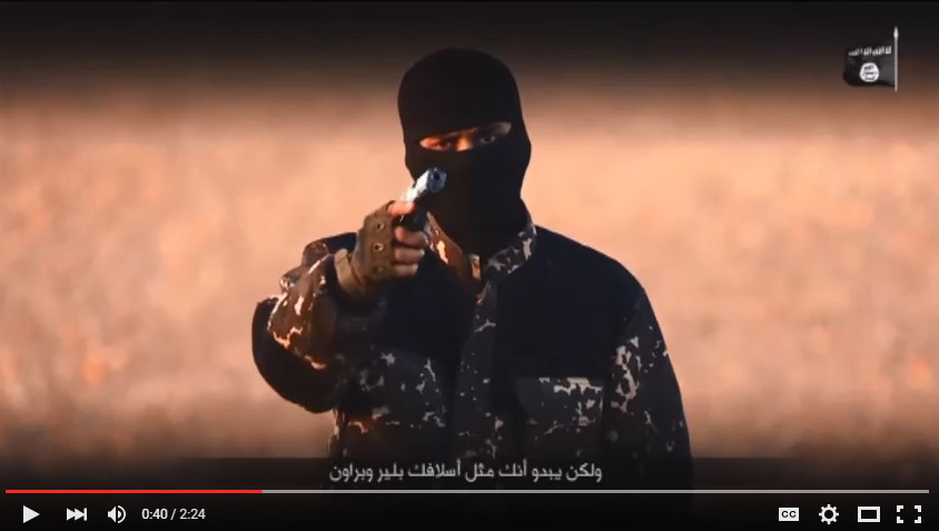 在激進組織「伊斯蘭國」(IS)最新公布的一段錄影畫面中,一名英國口音的蒙面男子發表訊息相英國首相卡麥隆(David Cameron)宣戰,講到激動時還不時將槍口對著鏡頭。影片中跪著5名身穿橘紅囚衣、據蒙面男子稱是「英國間諜」的人質,後面分別都站了一名蒙面人。