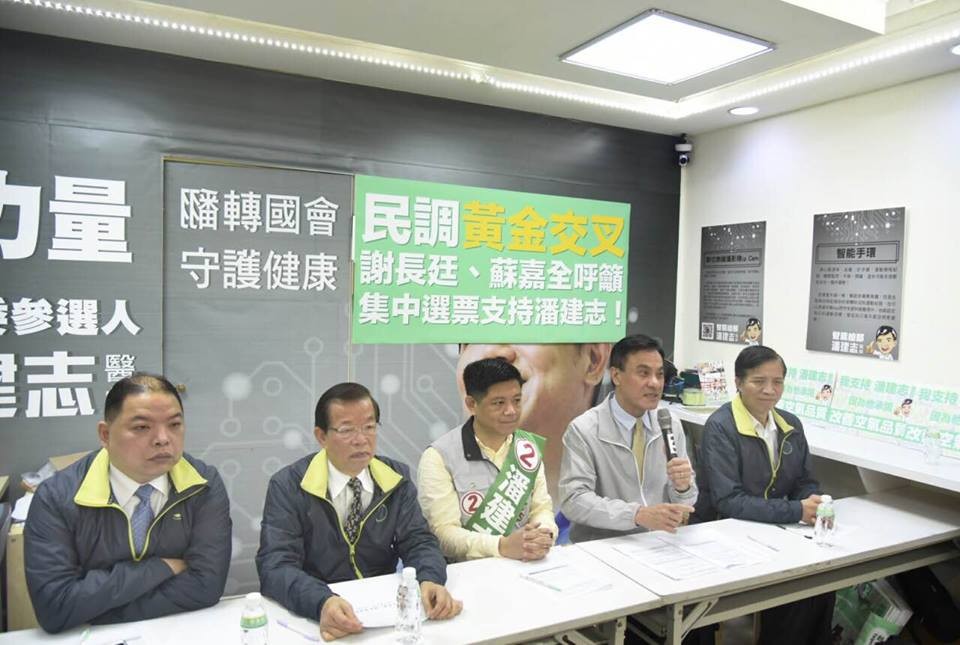 2016選舉倒數,按照規定,選前10日起不得公布民調,今天前行政院長謝長廷、蔡英文全國競選總部總幹事蘇嘉全等人,到台北市第三選區(中山區、北松山區)無黨籍立委候選人潘建志競選總部召輔選會議,現場公布潘建志最新民調,指出與國民黨候選人蔣萬安已呈現「黃金交叉」,甚至還小贏1.1%。