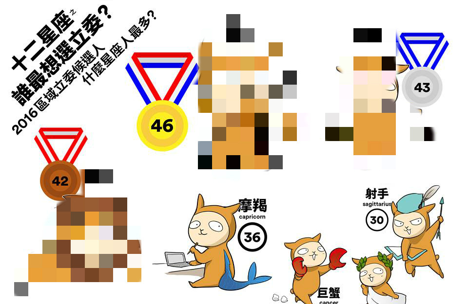 《沃草》自製了幽默風趣的圖表,列出這次選舉各星座的候選人人數,最多的是雙魚座,共有46位候選人;天秤座和獅子座則各有43位與42位候選人;最少的是牡羊座,只有20位。