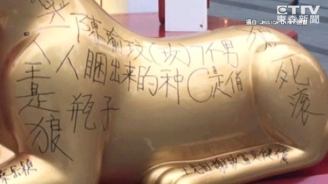 黃金豹身上被人用黑色簽字筆寫上「狼行當道,國浪當頭」、「狼死滾」之類一堆言不及意的文字,連尾巴也被簽名塗鴉,黃金豹當場變成大花豹。女網友發現後拍照po上網,一經分享至「爆料公社」火速引發關注,網友撻伐時在「太扯」、很沒水準和公德心,「現代人的素養怎麼會變成這樣?」