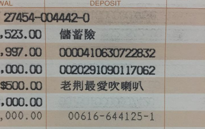 有位女網友日前跟友人訂購了一組藍牙喇叭,並立即用手機轉帳,「想說打個俏皮的註記,讓對方確認入帳時更加愉悅。」而昨日女網友到銀行臨櫃辦事時,看到女行員刷完簿子後偷偷竊笑,讓她心想「笑屁喔」;直到拿回存摺才知道,原來當時那個註記,「『老荊最愛吹喇叭』被列印在存摺上了,覺得超糗。」
