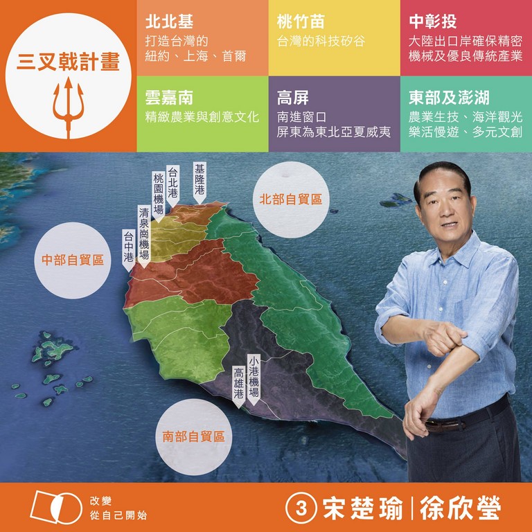 宋楚瑜也指出,將打造「北部自貿區」,以台北港、基隆港結合桃園機場,發展雲端網路跟電子商務、設計類文創產業;「中部自貿區」則是台中港結合清泉崗機場,發展精密機械、傳統產業,而「南部自貿區」為高雄港聯結小港機場,結合「南星計劃」,發展綠能產業帶,「總統投3號,經濟會更好!」