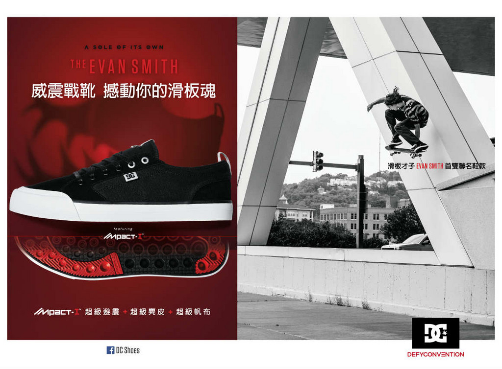 2016年 DC Shoes 由滑板選手 EVAN SMITH 聯名,推出首雙同名重量級鞋款!來自美國的 EVAN 年僅 24 歲,早已憑著超強實力和酷炫招式聞名於業界,除此,他更跨足音樂、攝影、塗鴉、創作等 5 大領域,也成為此次聯名系列的靈感來源。數字5的涵義是完滿、無束縛,和EVAN「滑板才子」的自由生活態度不謀而合,他特別構思「五角形」象徵熱愛的 5 種興趣,在鞋墊和多款服飾上皆可看到此幾何圖騰的蹤跡。