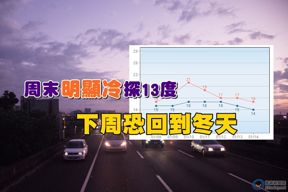 冷空氣持續南下!中央氣象局指出,8日清晨各地溫度又將稍微下降,中部以北及宜蘭將降到約15度,南部及花東稍高1度左右,感受偏冷,白天北東高溫仍只有16度左右,中南部則恢復多雲天氣,可達20度以上。入夜到9日(周六)清晨將是這波冷空氣影響最明顯時候,北台灣將下探13度。