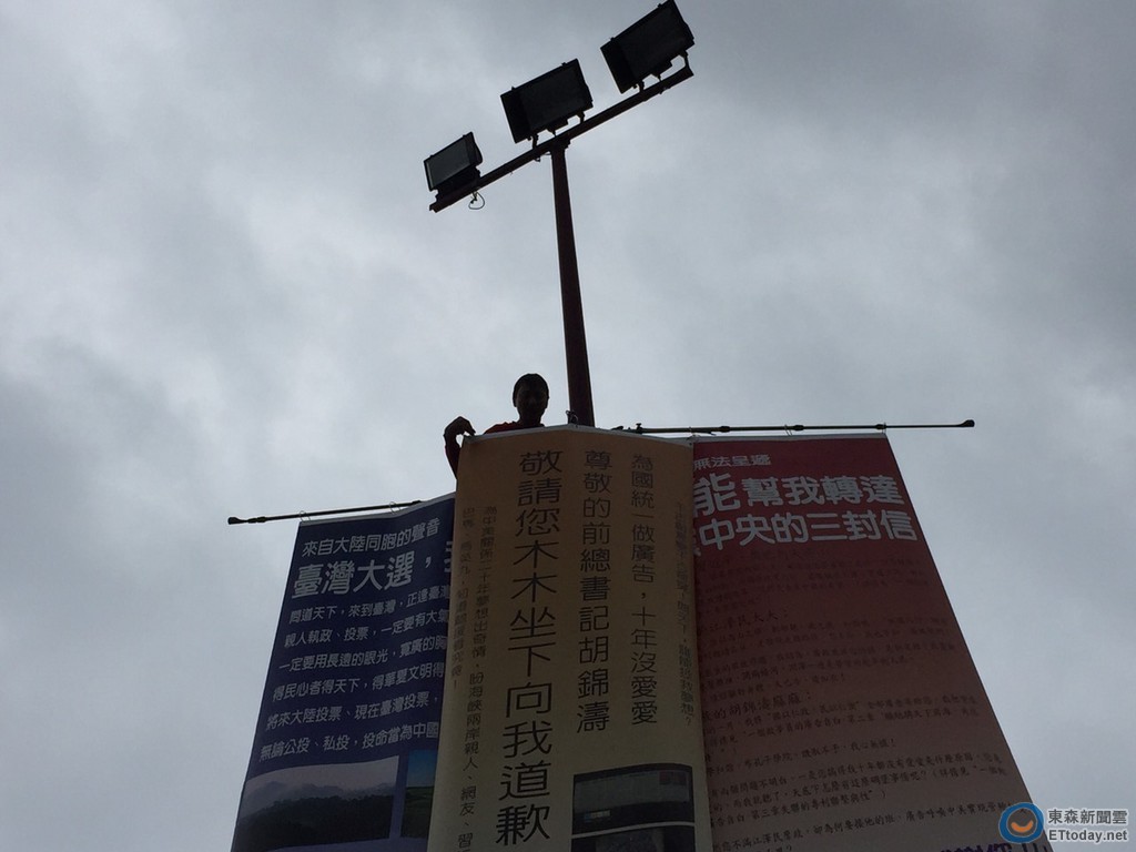 ▲畢姓陸客自由行入台,卻在今日到台北市民廣場,爬上燈桿掛布條,瘋狂舉動讓人不解。(圖/民眾提供)