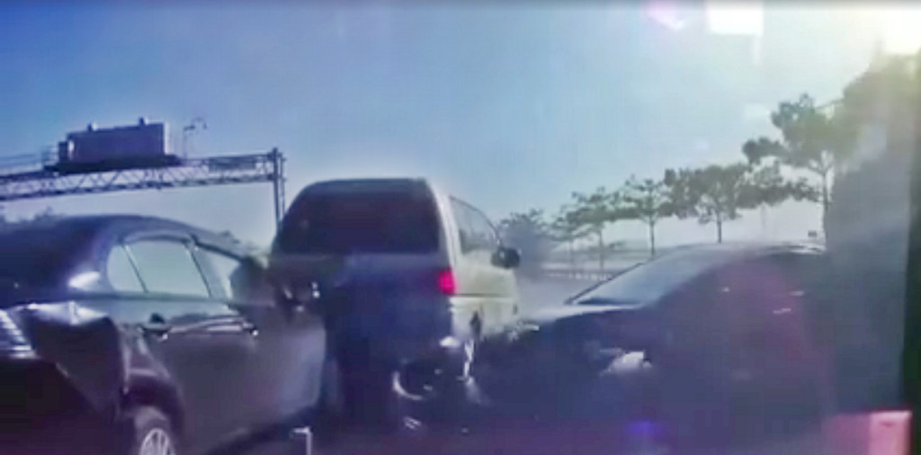 國1南下351.3公里岡山路段,下午2時許發生5輛小轎車疑似未保持安全距離,連環撞成一團,還從內側車道彈出到中間車道,導致後方貨櫃車剎車不及,又擦撞上去,一輛黑色轎車2度遭撞,當場90度轉彎,所幸無人受傷。過程被目擊網友PO上臉書社團「爆料公社」,嚇壞眾人驚呼「好可怕,人都沒事吧?」「好險剎住了」保持安全距離真的太重要!