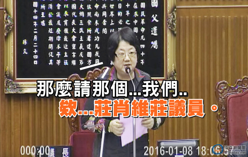 表決到第三案,審議人居環境預算案時,議長吳碧珠正要請王孝維發言,「好,那麼請那個…我們…」開了口卻停頓住,好像一時想不到名字,思索了一下,說道:「欸…莊肖維莊議員。」語畢兩眼轉呀轉,發現不對!叫錯名字,底下馬上傳來抗議聲「欸!」她趕緊敲了頭道歉:「噢不!王孝維王孝維王孝維王孝維王孝維王孝維。」