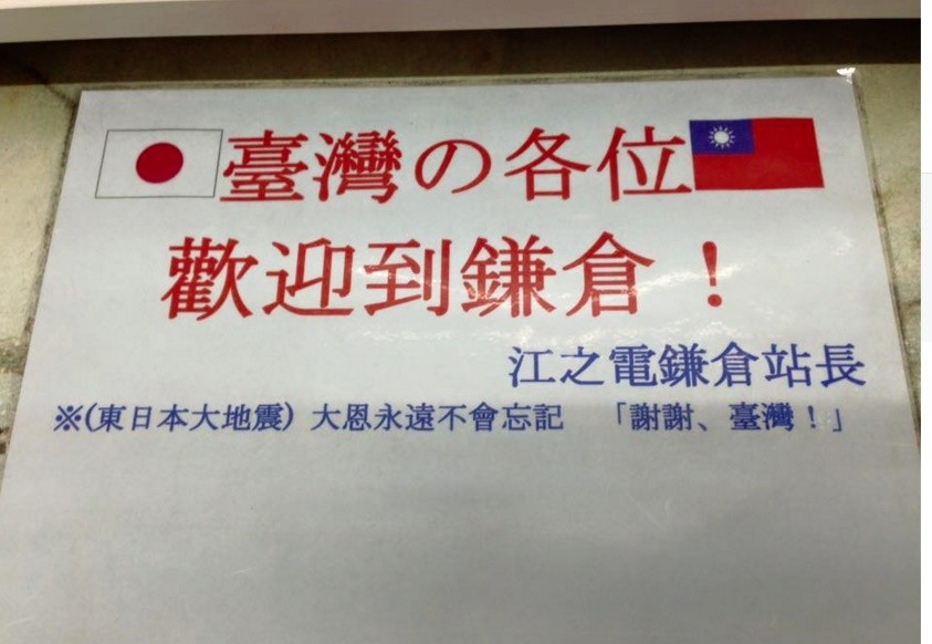 311大地震台灣給予協助及捐款,讓日本人一直感念在心!台大婦產科醫師施景中今天在臉書分享一名網友的貼文,日本江之島電鐵(江之電)鎌倉站長在車站掛了一個牌子,上面寫著「台灣の各位,歡迎到鎌倉!東日本大地震大恩永遠不會忘記,『謝謝、台灣』!」