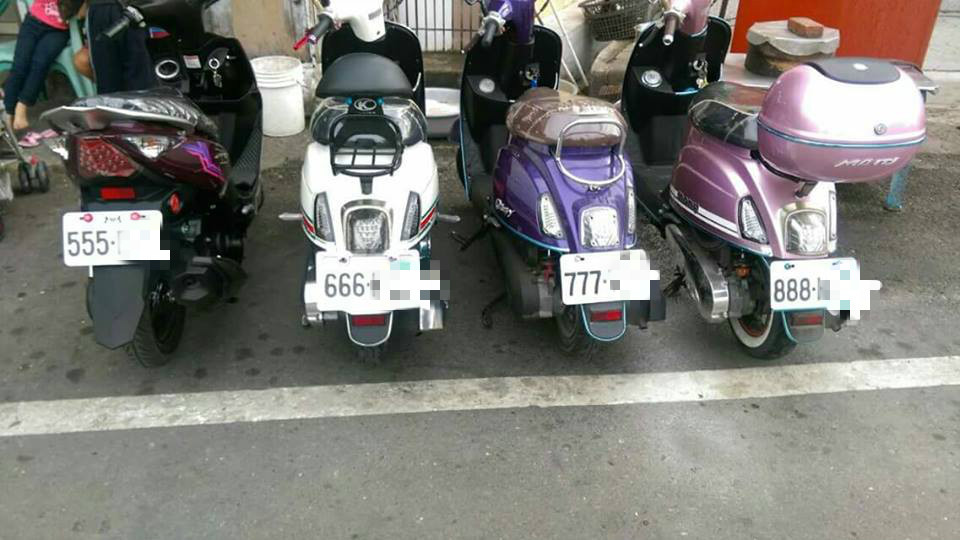 是在玩拉霸嗎?有網友在網路上分享4輛機車車牌連號的照片,而且剛好就是「555」、「666」、「777」、「888」,讓人直呼真的「太巧了」,有人甚至懷疑是租來的,但奇特的車牌照片仍引起討論。