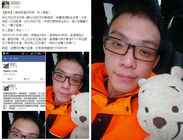網友在爆料公社發出訊息,指新北市政府一名消防員,10日晚間臉書透露輕生念頭,目前分隊跟家人已報案,卻仍然找不到人,手機已關機無法定位,希望網友可以幫忙尋找。