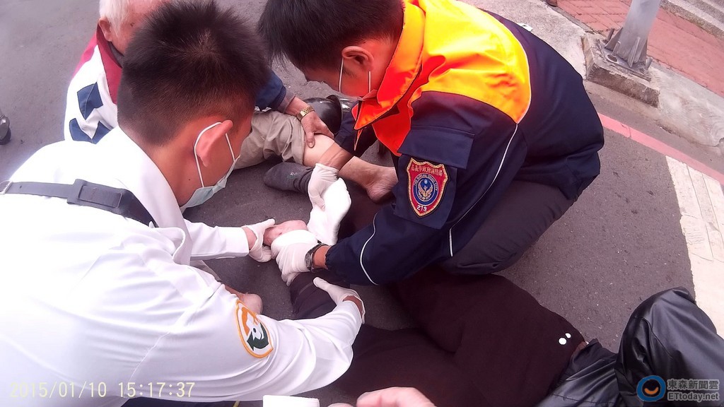 嘉義市政府消防局10日15時11分接獲民眾報案,指稱新榮路發生車禍案件,立即派遣湖內分隊前往處理。隊員簡明瑞、陳兪君、役男林哲宏趕抵現場,發現一對老夫妻騎車與自小客發生車禍,而老伯伯顧不得自己也受傷正幫愛妻做止血動作。