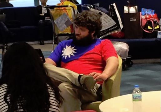 一名網友昨日在臉書不公開社團「爆料公社」PO照,指他松山機場巧遇翹著二郎腿、坐在大廳椅子上的「Angrypug」專注盯手機,身上還穿著印有「青天白日滿地紅」的台灣國旗T恤。由於他的航線是台北飛上海,原PO寫到就說,「不知道到浦東機場後會不會發生什麼有趣的事」;只是沒多久後,有網友指出,「他被留在飛機上了」。