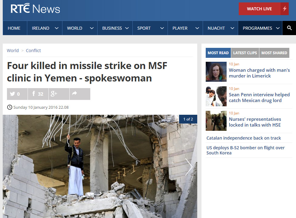 「無國界醫生組織」位於阿富汗昆都茲(Kundunz)的醫院,去年10月才剛遭到美軍誤炸,本月10日位於葉門北部薩達省拉澤(Razeh)的一家醫院,又遭到以沙烏地阿拉伯為首的聯軍誤襲,造成至少4人死亡、10人受傷。