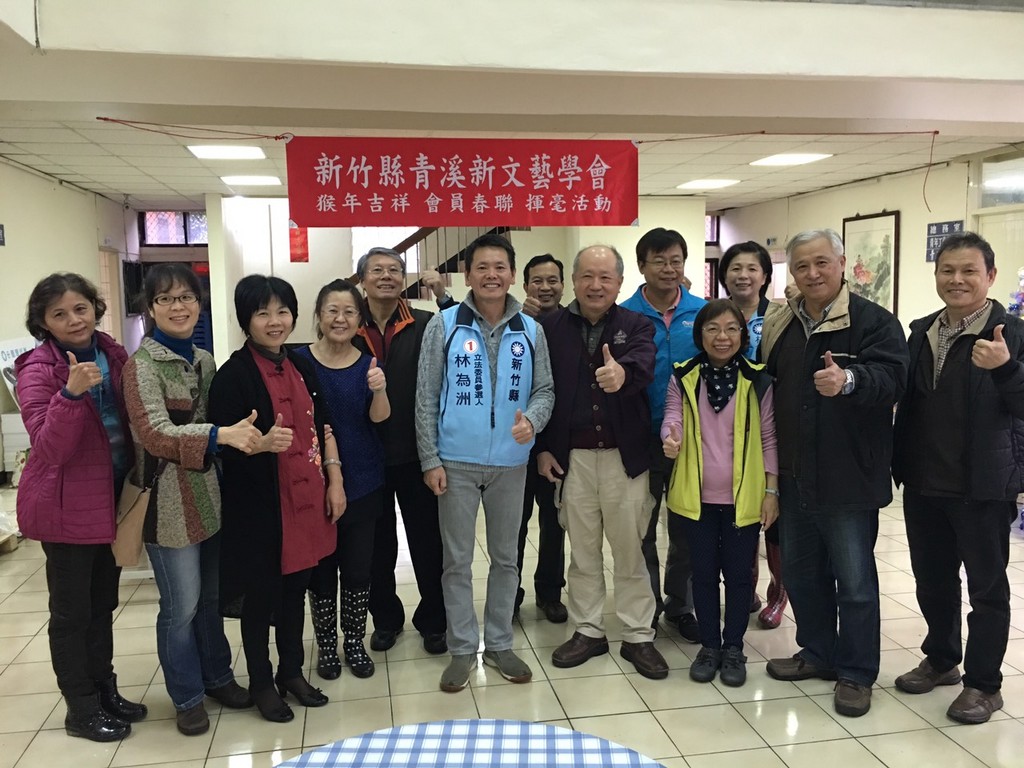 新竹縣青溪新文藝學會理事長邱炳亮表示,會員裡有多位書法家,不乏舉辦過個展或聯展的人,為了推廣書畫藝術,所以在農曆春節前規畫多場致贈春聯、年畫的相關活動,首場就辦在林為洲競選總部。